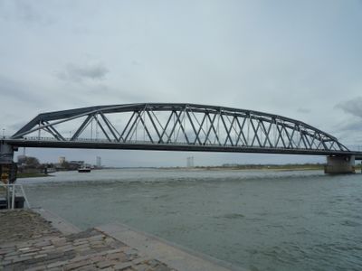 El puente ferroviario de Nijmegen se extiende 675 metros sobre el río Waal, con un tramo central de 235 metros construido con cerchas de acero.