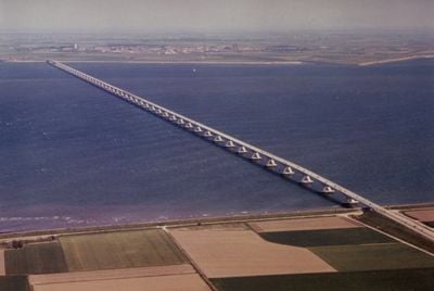 El Puente de Zelanda se extiende sobre el estuario del Escalda Oriental con 54 pilares de hormigón que sostienen 52 tramos a lo largo de 5.022 metros.