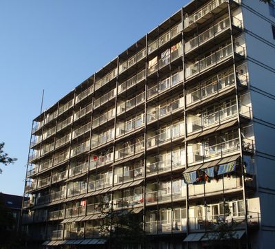 El Bergpolderflat es un edificio residencial de estructura de acero en Rotterdam con nueve pisos que contiene 72 apartamentos. La estructura destaca por sus grandes paneles de ventanas y un diseño claro donde el marco de acero visible funciona como sistema constructivo aparente.