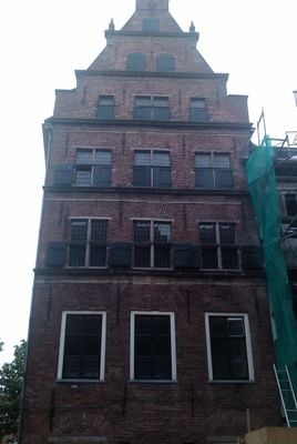 El edificio del siglo XVI exhibe elementos arquitectónicos alemanes y flamencos con una placa de piedra que muestra la inscripción 'In di drie vergulde herick'.