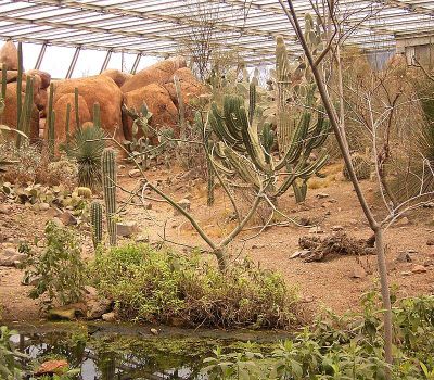 El edificio del desierto alberga numerosas especies de cactus y flora desértica en un entorno con temperatura controlada que replica las condiciones áridas naturales.