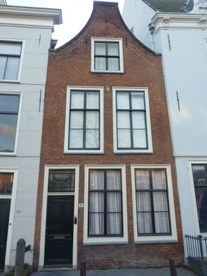Poortje. Geprofileerd gemetseld rondboogpoortje van geslepen steen. Boven poortje ovaal venster met smeedwerk