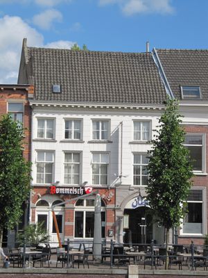 Pand met gebosseerd geelgepleisterde lijstgevel