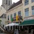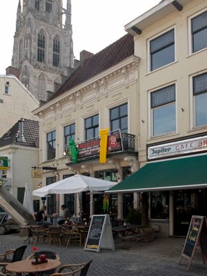 Pand met gebosseerd geelgepleisterde lijstgevel