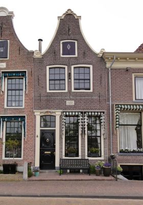 Huis met klokgevel met geveltop met natuurstenen aanzetvoluten en topstuk met jaartalcartouche en schelpversiering