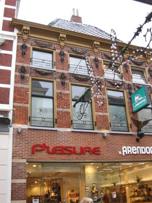 Dubbel pand met versierde gevel en lijst, building in Groningen, Netherlands