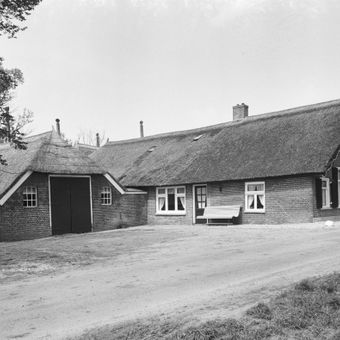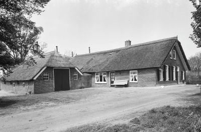 Boerderij van het Kampertype met rieten zadeldak en links aangebouwd een kleine stal met rieten wolfsdak