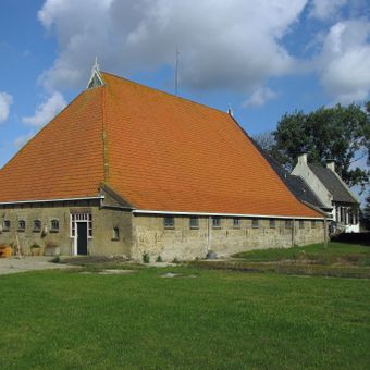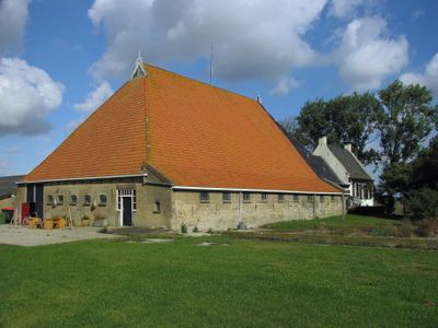 Grote kop-rompboerderij met alleen achteraan onderkelderd voorhuis, gepleisterde topgevel met gesloten top met kleine lichtopeningen en omlopende houten goot