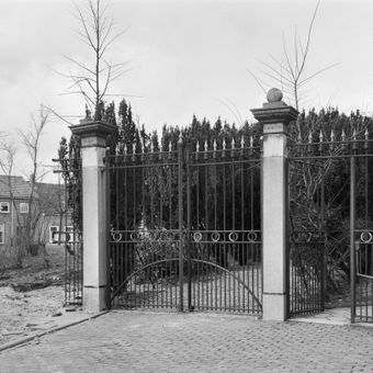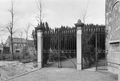 Naast de kerk het toegangshek tot het kerkhof met twee hardstenen hekpijlers,, Rijksmonument op Voorstraat 52