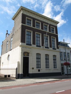Breed koopmanshuis van parterre en verdieping met brede middenrisaliet, waarin hardstenen poortomlijsting met gebeeldhouwd opschrift "Noord-Holland" en jaartal