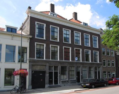 Breed koopmanshuis van parterre en verdieping met brede middenrisaliet, waarin hardstenen poortomlijsting met gebeeldhouwd opschrift "Noord-Holland" en jaartal