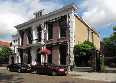 Breed koopmanshuis van parterre en verdieping met brede middenrisaliet, waarin hardstenen poortomlijsting met gebeeldhouwd opschrift "Noord-Holland" en jaartal