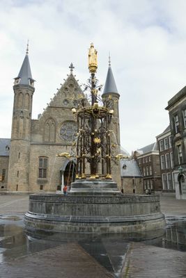 La Fuente Binnenhof mide 640 centímetros de altura y presenta diseños góticos con gárgolas doradas y escudos heráldicos cerca del Ridderzaal.