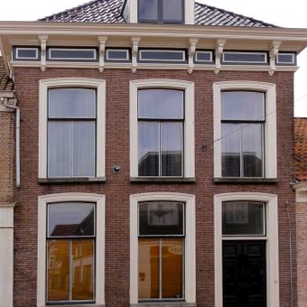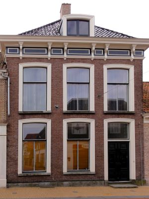 Groot sober rechthoekig pand met kroonlijst en voordeur met pilasteromlijsting