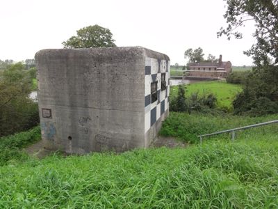 Voormalig wachthuis, thans benzinepompstation. Gebouwtje met dichtgemetselde bogen, waarvan de aanzetten en sluitstenen in natuursteen. In de vulwanden later weer vensters en een deur uitgebroken.