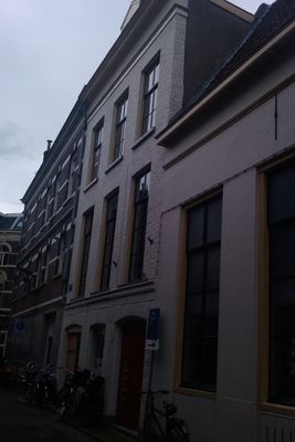 Pakhuis met aan de gasthuissteeg een puntgevel met ezelsruggen en bakstenen tweelichtskozijnen
