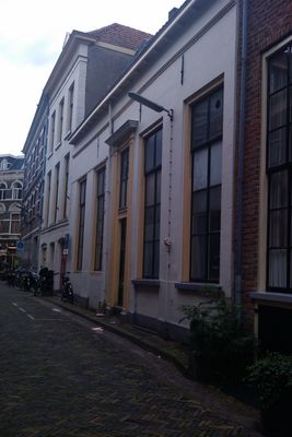 Pakhuis met aan de gasthuissteeg een puntgevel met ezelsruggen en bakstenen tweelichtskozijnen