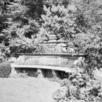 Twickel: gietijzeren tuinvaas achter de tuinbank in de oranjerietuin (donkergrijs geschilderd) in schaalvorm op sokkel van beton