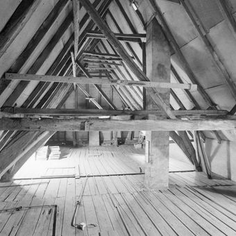 Door een diep erf van de straat gescheiden pand met half schilddak en gepleisterde lijstgevel
