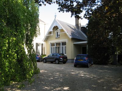 Blokvormige villa heeft twee bouwlagen en is schuin op de weg gesitueerd