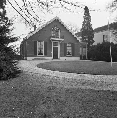Blokvormige villa heeft twee bouwlagen en is schuin op de weg gesitueerd