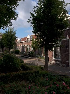 Complex arbeiderswoningen met bijbehorende tuinmuurtjes met hekwerken
