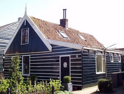 Houten huis met aangebouwde zijbeuk aan de rechterzijde en puntvormig voorschot, house in Amsterdam, Netherlands
