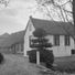 Ten dele houten huis met bakstenen puntgevel, voorzien van een halsje onder gebogen afdekking