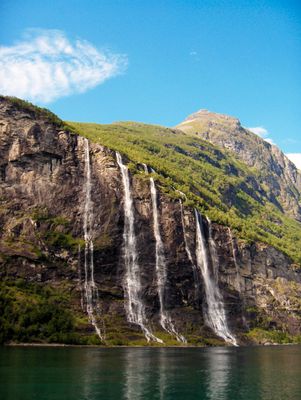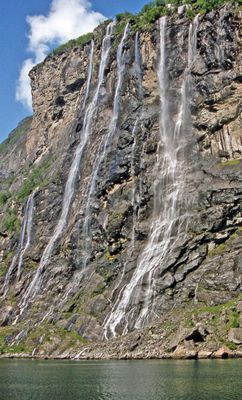 Siete corrientes separadas forman esta cascada de 410 metros, creando caídas paralelas de agua que fluyen directamente al Geirangerfjord.