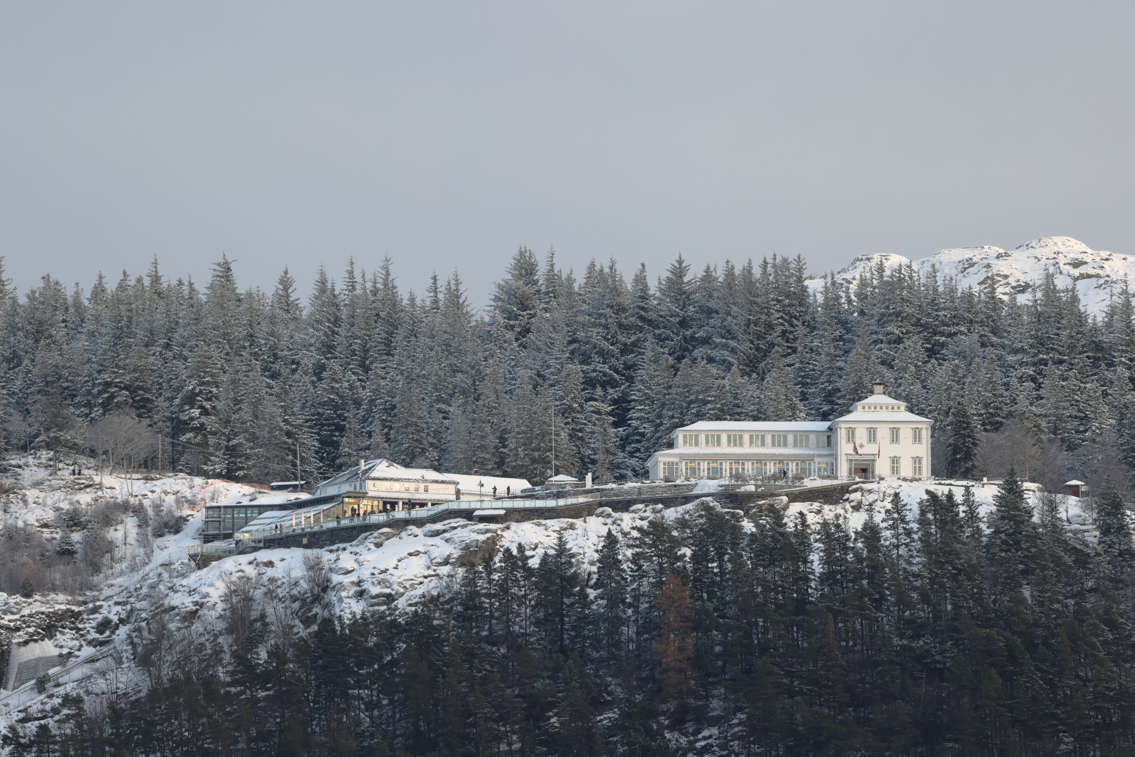 La montaña presenta un bosque decorado con figuras de trolls, conectando a los visitantes con el folklore y elementos mitológicos noruegos.