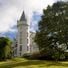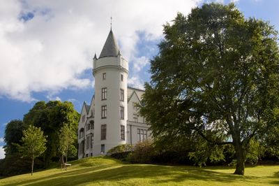 El castillo de piedra blanca combina arquitectura de fortaleza medieval con estilo baronial escocés, con altas torres y detalles elaborados en piedra.