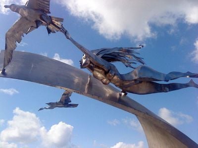 La escultura presenta una figura femenina que representa a Anfitrite junto a dos aves marinas deslizándose sobre una gran ola geométrica.