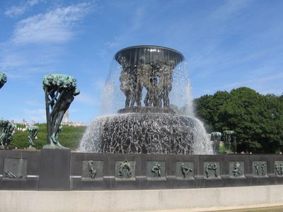 La Gran Fuente es la pieza central del Parque de Esculturas de Vigeland, con numerosas figuras de bronce dispuestas alrededor de un estanque central que canaliza el agua a través de varios canales y cuencas. La estructura ocupa una amplia zona e integra agua, piedra y metal en una composición artística unificada.