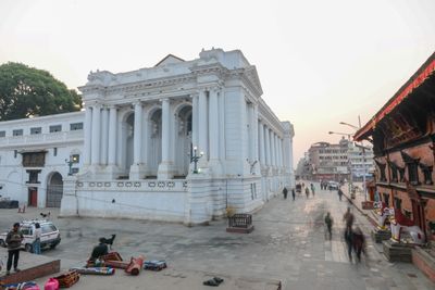 El Gaddi Baithak exhibe columnas blancas y elementos arquitectónicos europeos en el centro del distrito histórico de Katmandú.