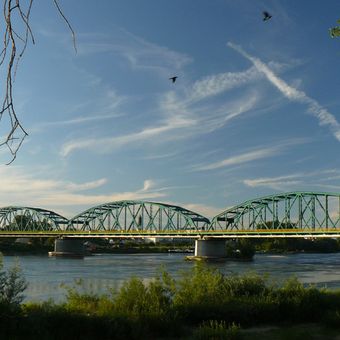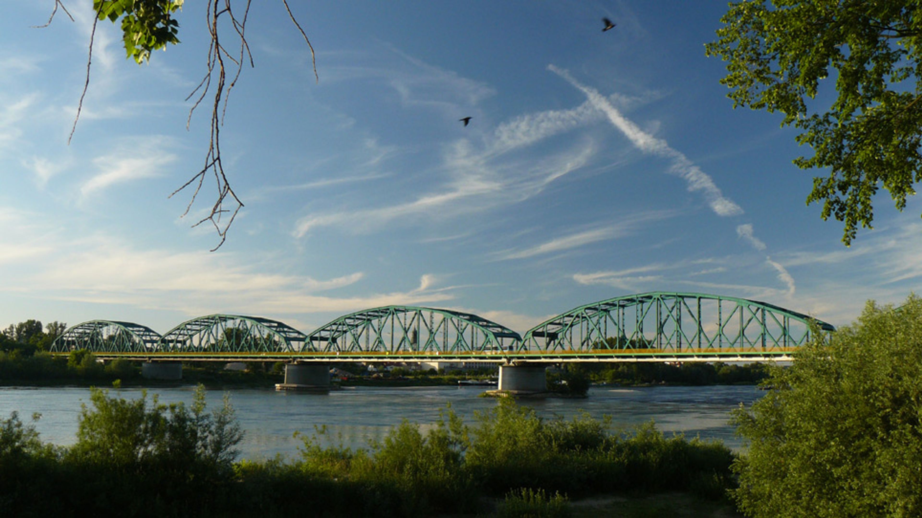 El puente de armadura de acero se extiende 1001 metros sobre el río Vístula con catorce tramos que soportan tráfico vehicular y ferroviario.