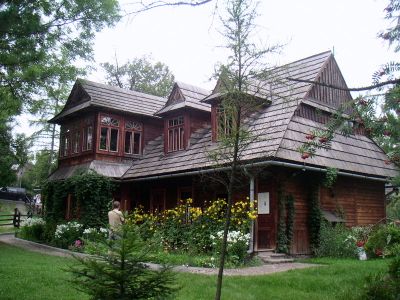 La estructura de madera ejemplifica el estilo arquitectónico regional de Zakopane, con detalles ornamentales característicos y ventanas mansardas añadidas en 1926.