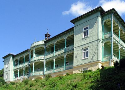 El edificio del monasterio presenta una construcción mixta con planta baja de ladrillo y pisos superiores de madera en estilo suizo.