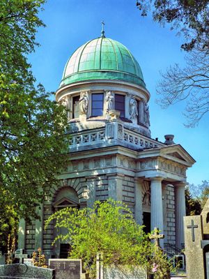 El mausoleo de ladrillo exhibe arquitectura neoclásica con proporciones armoniosas dentro del cementerio católico en la calle Ogrodowa de Łódź.