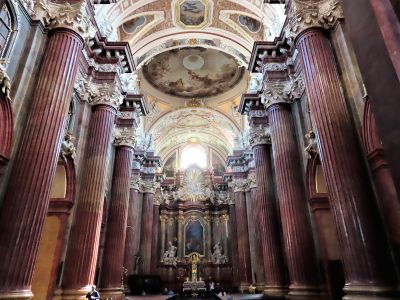 La Poznań Fara es una iglesia barroca en Poznań sostenida por dieciséis grandes columnas que elevan la nave principal. El interior se extiende aproximadamente 55 metros en una dirección y presenta elaboradas decoraciones de estuco y pintura.