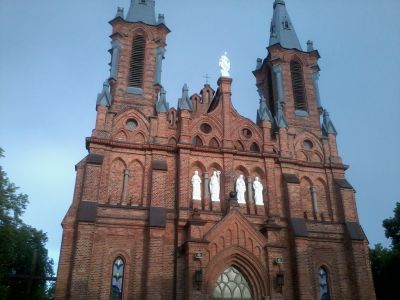 La Iglesia de San Pedro y San Pablo presenta una construcción de ladrillo con arcos apuntados, altas agujas y grandes vidrieras características del estilo neogótico.