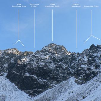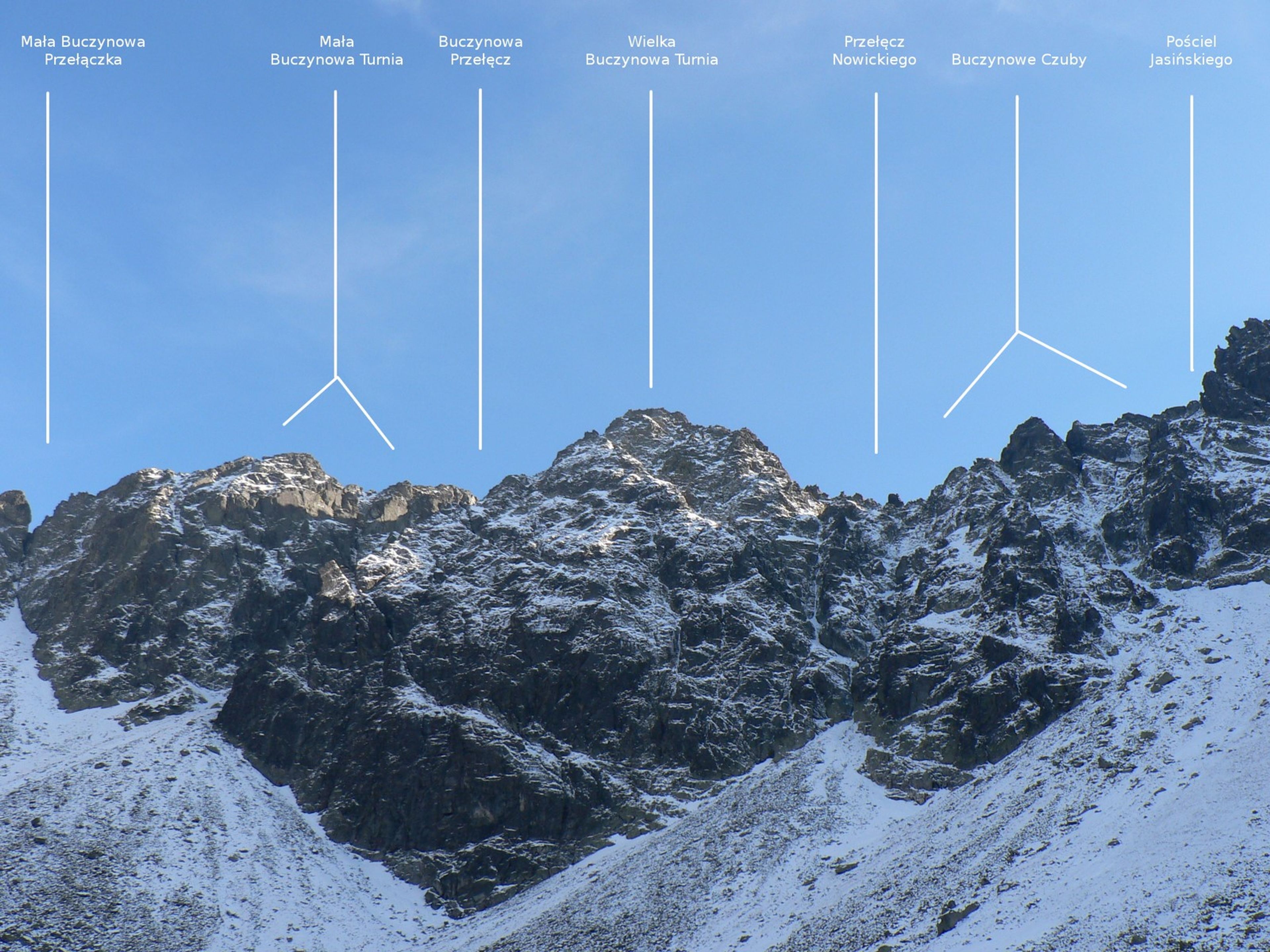 La Mała Buczynowa Turnia alcanza los 2171 metros de altura y presenta dos picos principales separados por un pequeño puerto entre Wielka Buczynowa Turnia y Ptak.