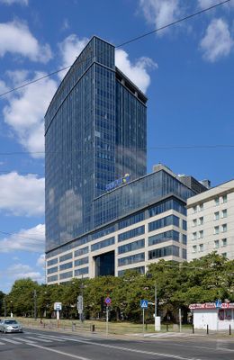 El edificio se encuentra entre el rascacielos Intraco I y el estadio Polonia Warszawa, formando parte de la arquitectura comercial moderna en el centro de Varsovia.