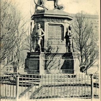 Cuatro soldados esculpidos representando generales comandantes flanqueaban las placas inscritas del memorial, que enumeraban nombres de oficiales caídos del V Cuerpo.