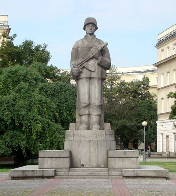 El monumento de bronce alcanza 16 metros de altura, presentando un soldado con un arma PPSh-41 y capa ondulante en la intersección Wybrzeże Helskie.