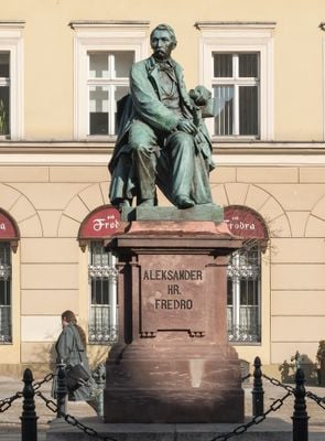 La estatua conmemora al dramaturgo polaco Aleksander Fredro, autor de numerosas obras de teatro cómicas y poemas durante el período romántico.