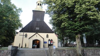 La Iglesia de la Asunción de la Virgen María presenta elementos arquitectónicos tradicionales polacos con exterior blanco y campanario central.
