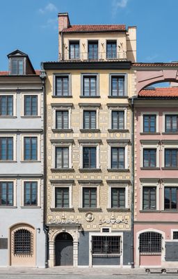 La estructura representa una kamienica tradicional polaca, un tipo de residencia urbana que definió el carácter arquitectónico del centro histórico de Varsovia.