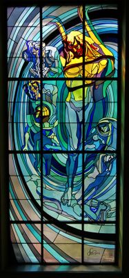 La vidriera muestra a Apolo atado a una lira, rodeado por cuerpos celestes como Saturno, Júpiter, Marte, Mercurio, la Tierra y Venus.