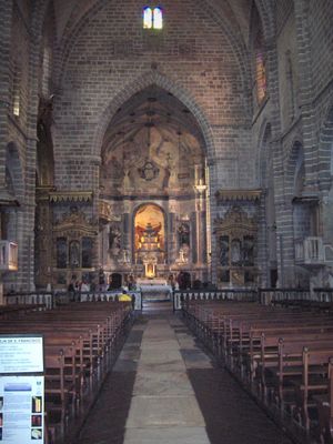 La iglesia presenta una nave monumental con bóveda ojival que incorpora símbolos como la cruz de la Orden de Cristo y escudos reales portugueses.