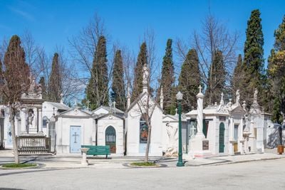 El cementerio ocupa 12 hectáreas con caminos paralelos bordeados de cipreses, ofreciendo vistas al río Tajo y al Puente 25 de Abril.